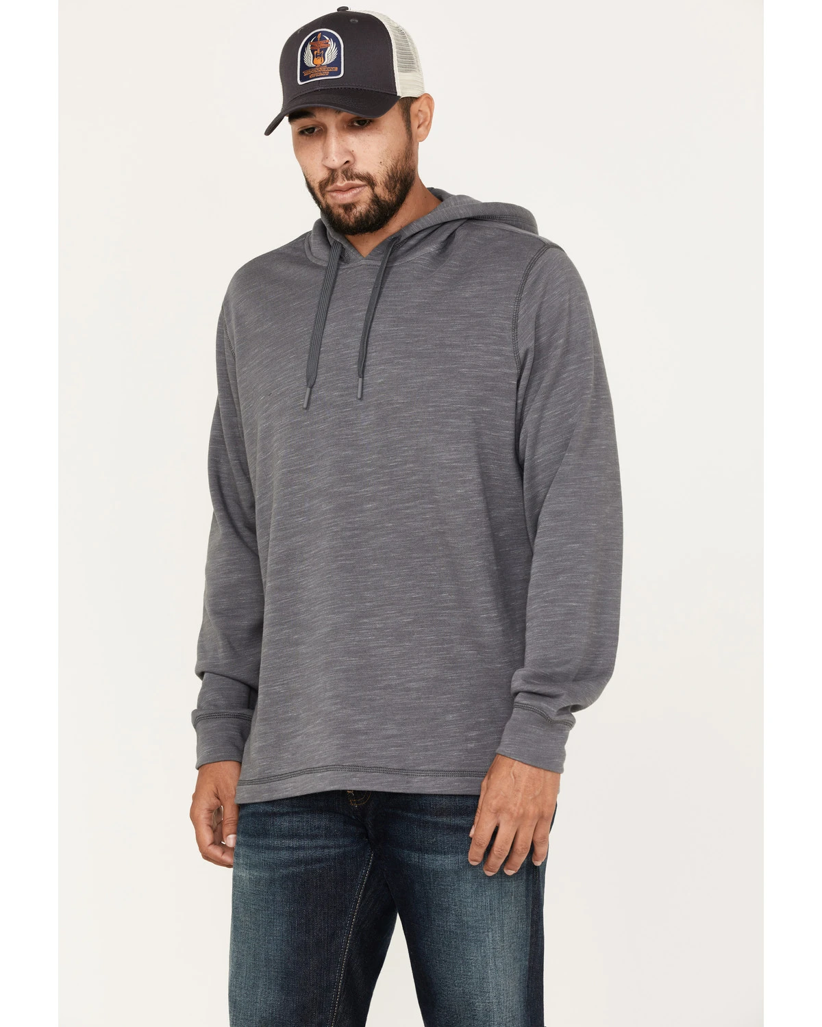- Attached hood with drawstring cords