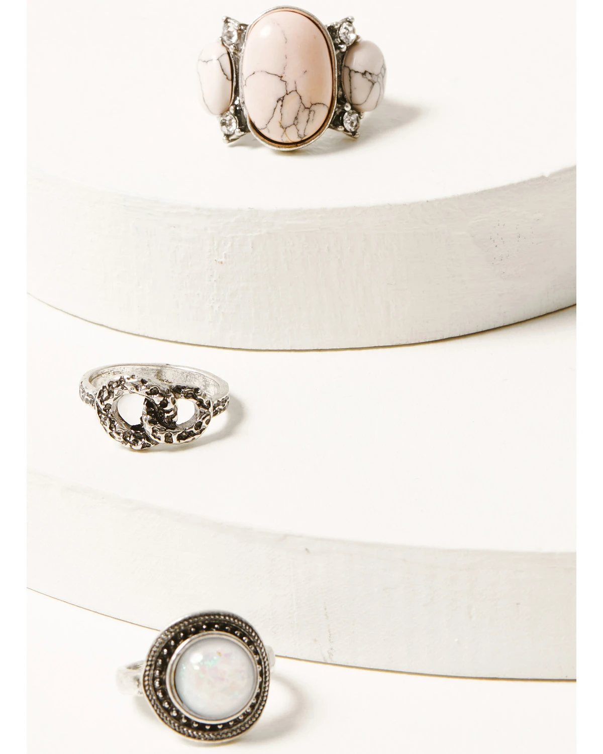 - Pink marble center and side stones with four-corner faux diamond detail