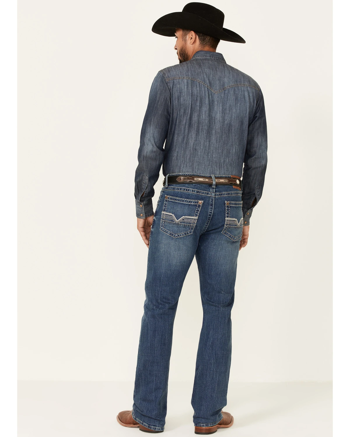- Heavy “V” stitching on back pockets